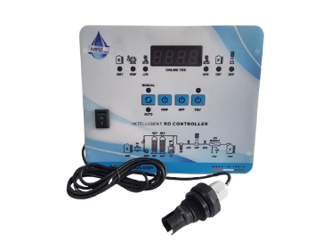 An automatic control panel used in 250 LPH RO water systems. It controls pumps, valves, and flushing automatically and checks water quality.